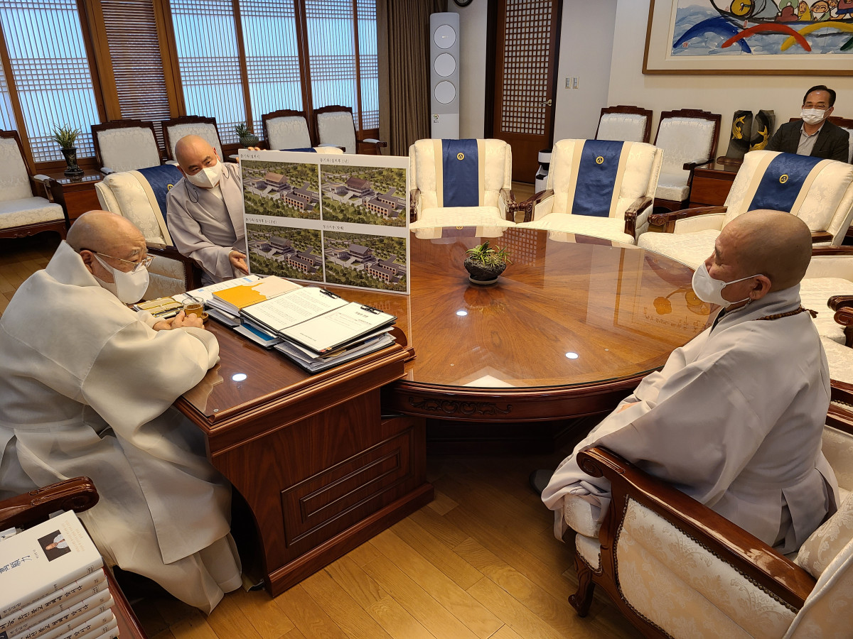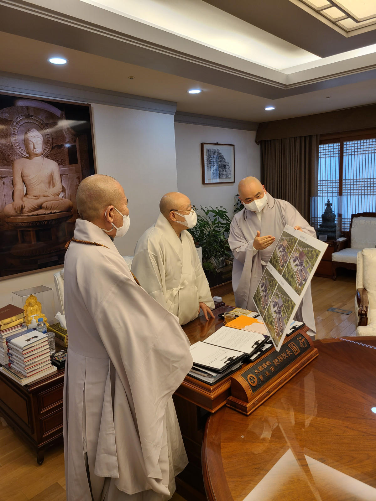 3월 3일 군종특별교구장 선묵혜자 스님과 부교구장 성진 스님은 총무원장 원행 스님을 찾아 계룡대 호국 홍제사 불사에 대해 보고 했습니다.