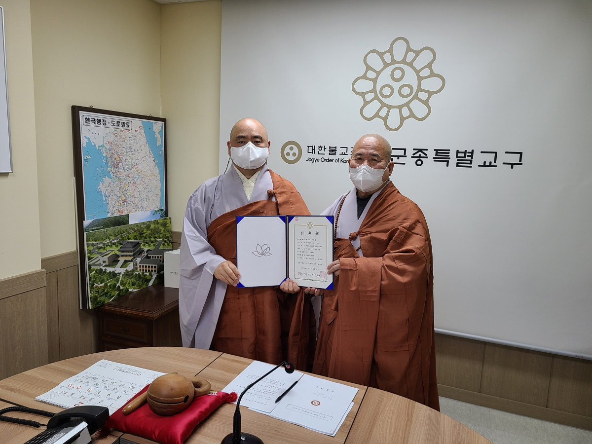 회의에 앞서 교구장스님은 사무총장 성진 스님에게 부교구장 임명장을 전달했습니다.