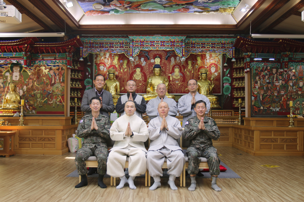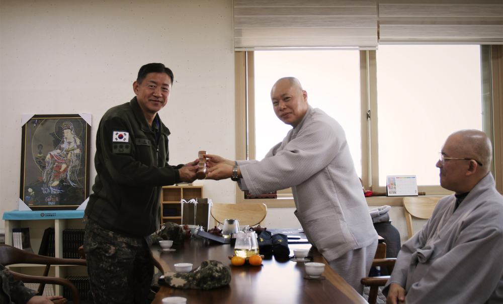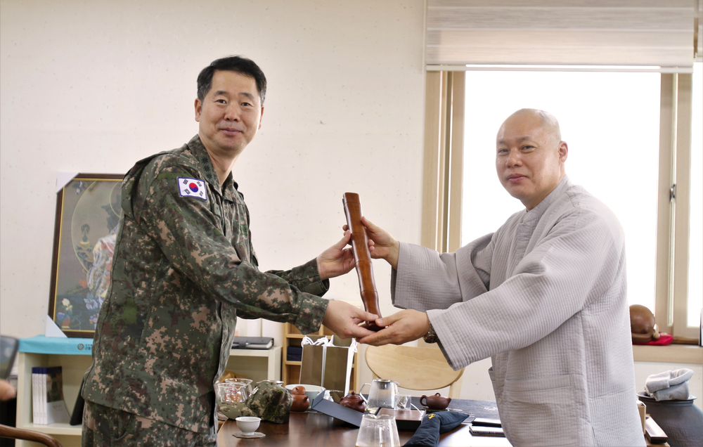 불기2567(2023)년 11월 22일(수) 불자 장군 진급자 2명이 국방부 원광사에서 제7대 교구장으로 취임하신 법원스님으로부터 격려 기념품을 전달받으셨습니다.