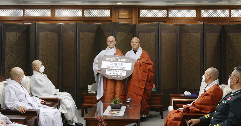 또한 이 자리에서 능원스님께서는 군종특별교구 발전을 위한 가장 중요한 첫 발걸음은 준 완공상태인 계룡대 호국 홍제사 건립 불사를 마무리하는 것으로 여겨, 백만원력결집불사 홍제사 건립기금 1억 원을 희사하셨습니다.