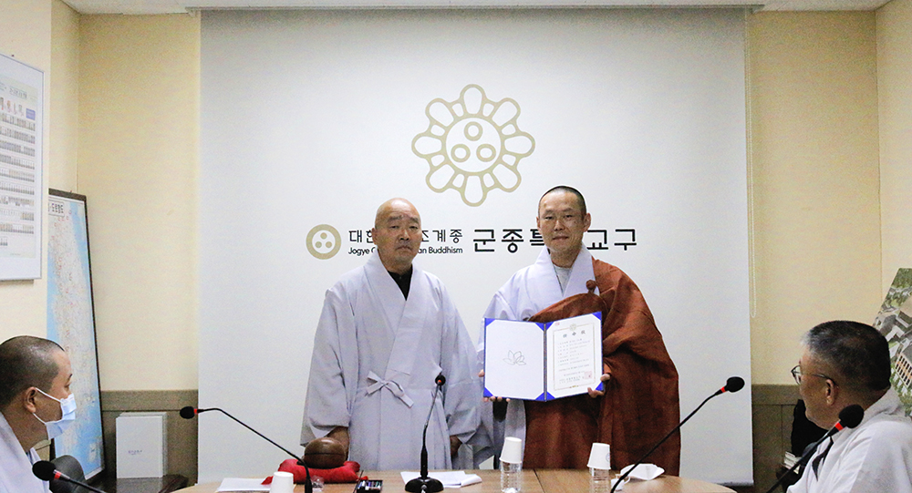 먼저, 차기 교육국장으로 특수전사령부 호국사자사 주지 소임을 맡고 계신 원상 이왕우 법사님이 임명되셨습니다.